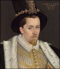 James VI of Scotland, son of imprisoned Mary, Queen of Scots, was raised in drafty Scottish castles by self-serving lords. He grew up religious and well-trained in theology. He went to church every day. But he was rude, rough, loud, conceited, and bisexually immoral. He was also shrewd. At age 37 he managed to succeed his cousin, Elizabeth I, as England’s monarch.