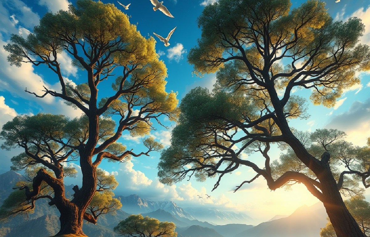 Trees raise their limbs to the sky