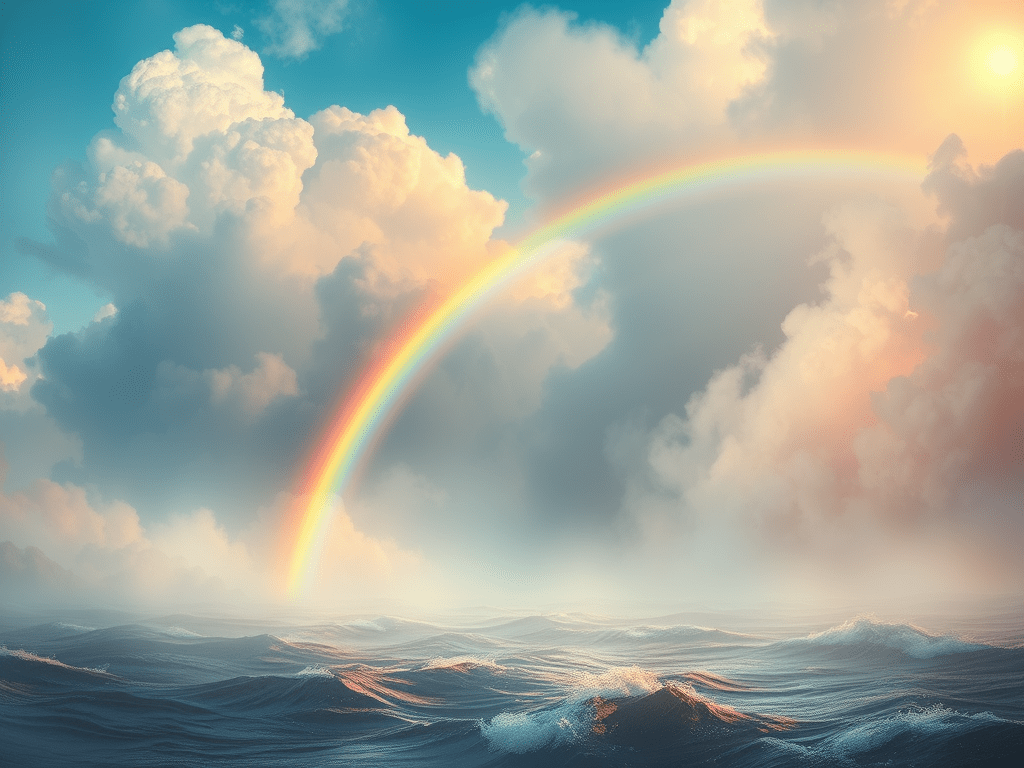 The rainbow stands, a covenant true,